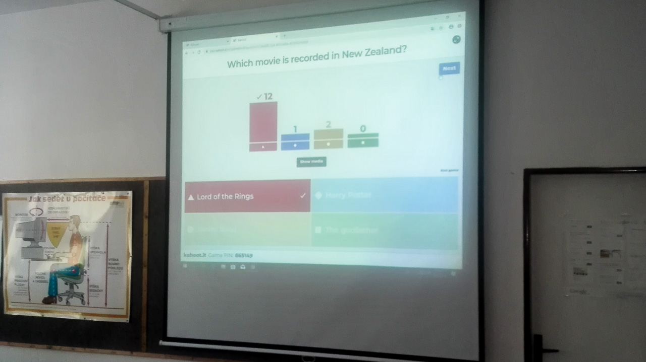 Žáci soutěžili pomocí hlasovacího zařízení KAHOOT a záleželo nejen na znalostech, ale také na schopnosti porozumět otázce kladené v angličtině a na rychlosti rozhodování.
