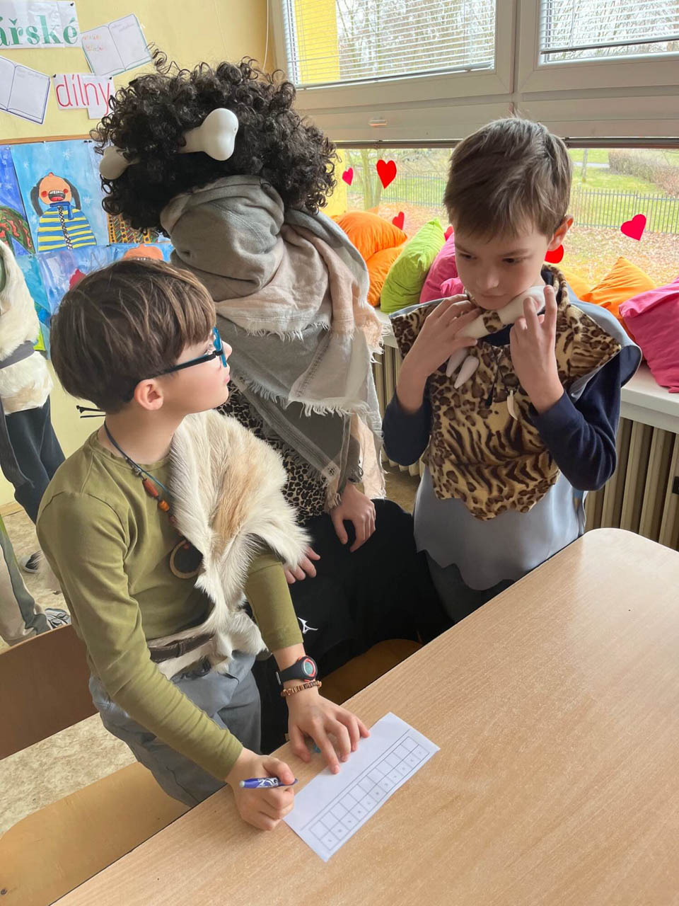 V pátek 24. 2. 2023 žáci 4. B cestovali časem a přesunuli se do pravěku. Proč zrovna pravěk? Ve vlastivědě se začínáme seznamovat s počátky člověka na naší Zemi a jak jinak si to osvojit, než se stát přímo pralidmi.