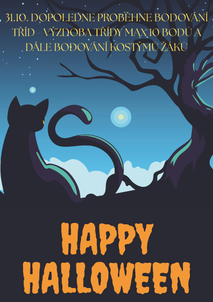 v pátek 31. října si společně užijeme halloweenskou atmosféru ve škole. Třídy budou strašidelně vyzdobené a celé dopoledne si zpestříme tím, že přijdeme v halloweenských kostýmech. Těšíme se na vaše nápadité masky a na veselé, i když trochu strašidelné dopoledne! 🎃