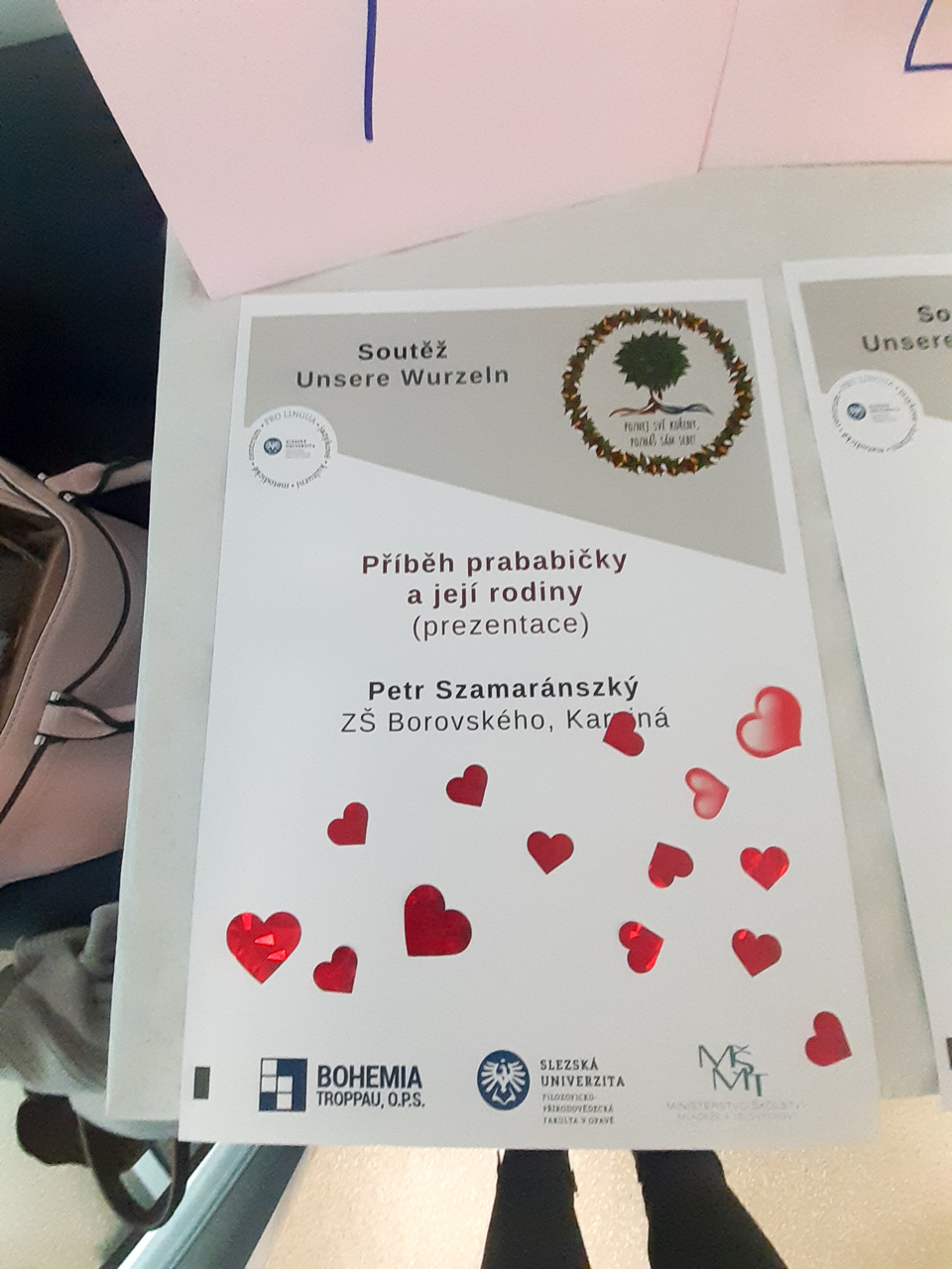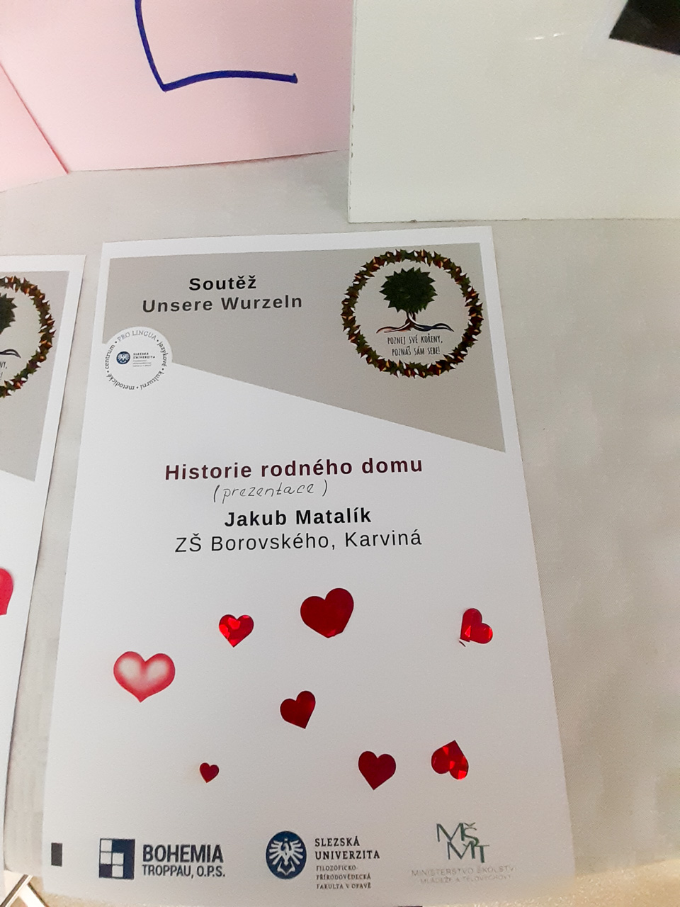 Ve čtvrtek 6. 11. 2025 reprezentovali čtyři žáci naši školu na německé soutěži Unsere Wurzeln v Kravařích ve Slezsku. Na tamějším zámku představili na vernisáži příběhy svých předků nebo předměty, které se váží ke společným česko-německým dějinám. Nejlépe se umístil Martin Koribanič z 6. B, a to těsně na 4. místě. Jemu i ostatním účastníkům Kubovi Matalíkovi, Péťovi Szamaránszkému i Míšovi Železnému z 8. C blahopřejeme k velmi dobrým a pěkným výkonům.