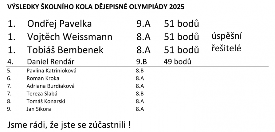 Dne 27.11. 2025 proběhlo školní kolo dějepisné olympiády. Vítězové byli hned 3 soutěžící, kteří nás budou reprezentovat v kole okresním. Všem účastníkům děkuji za účast a vítězům přeji úspěch v dalším kole!