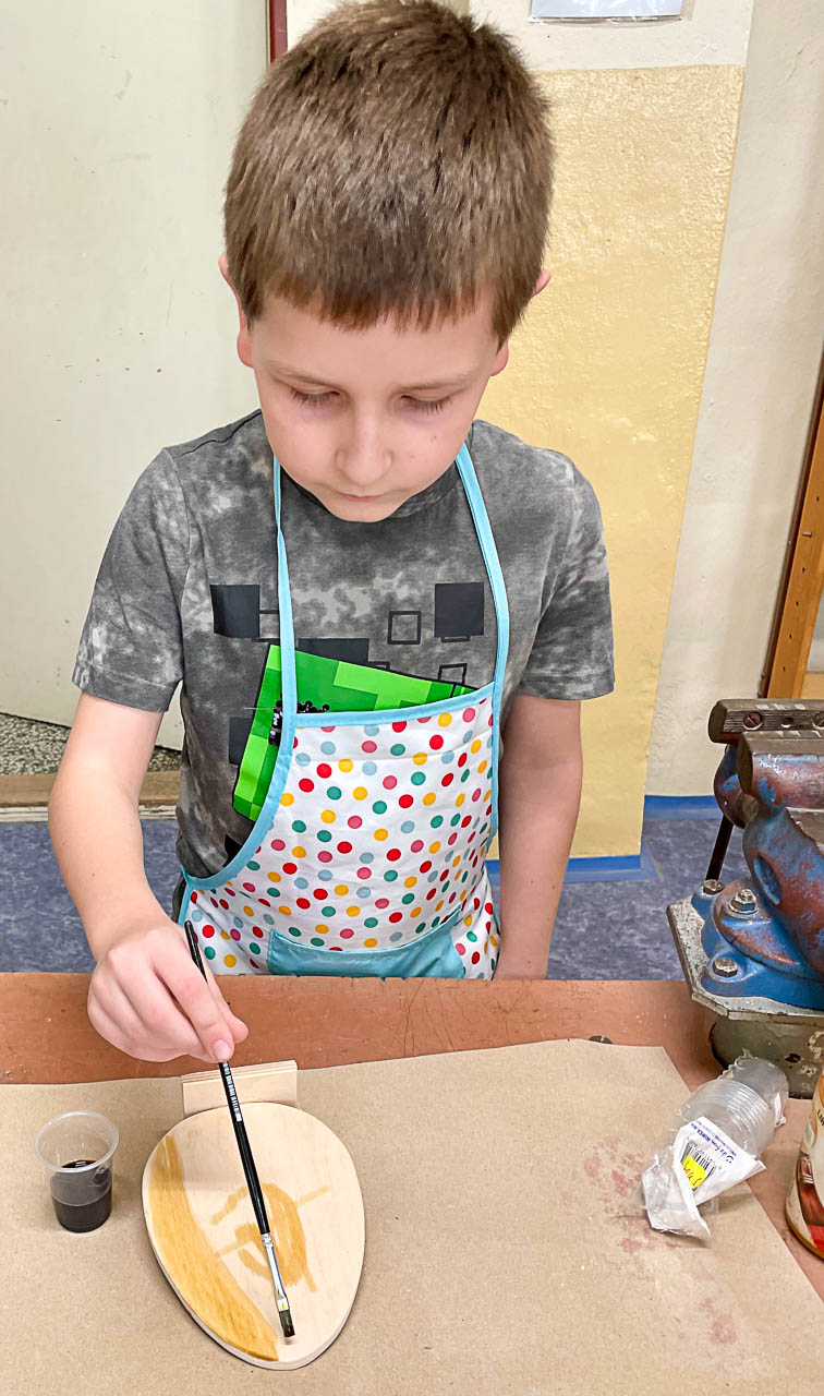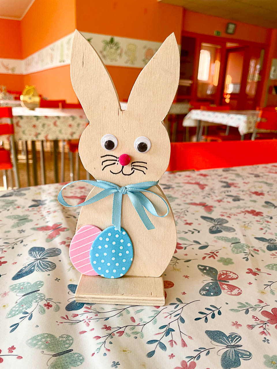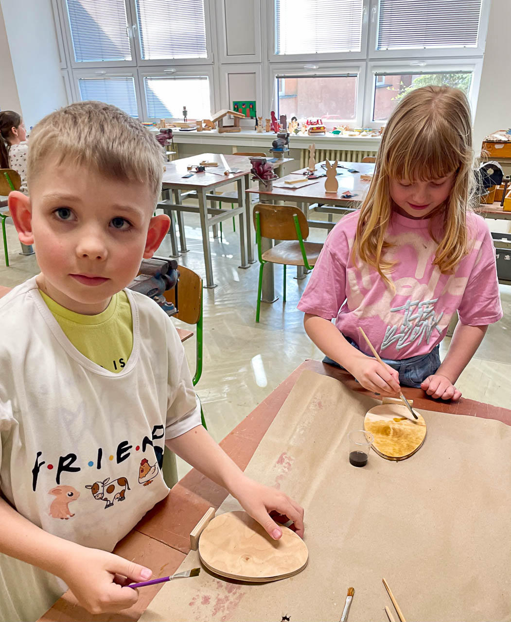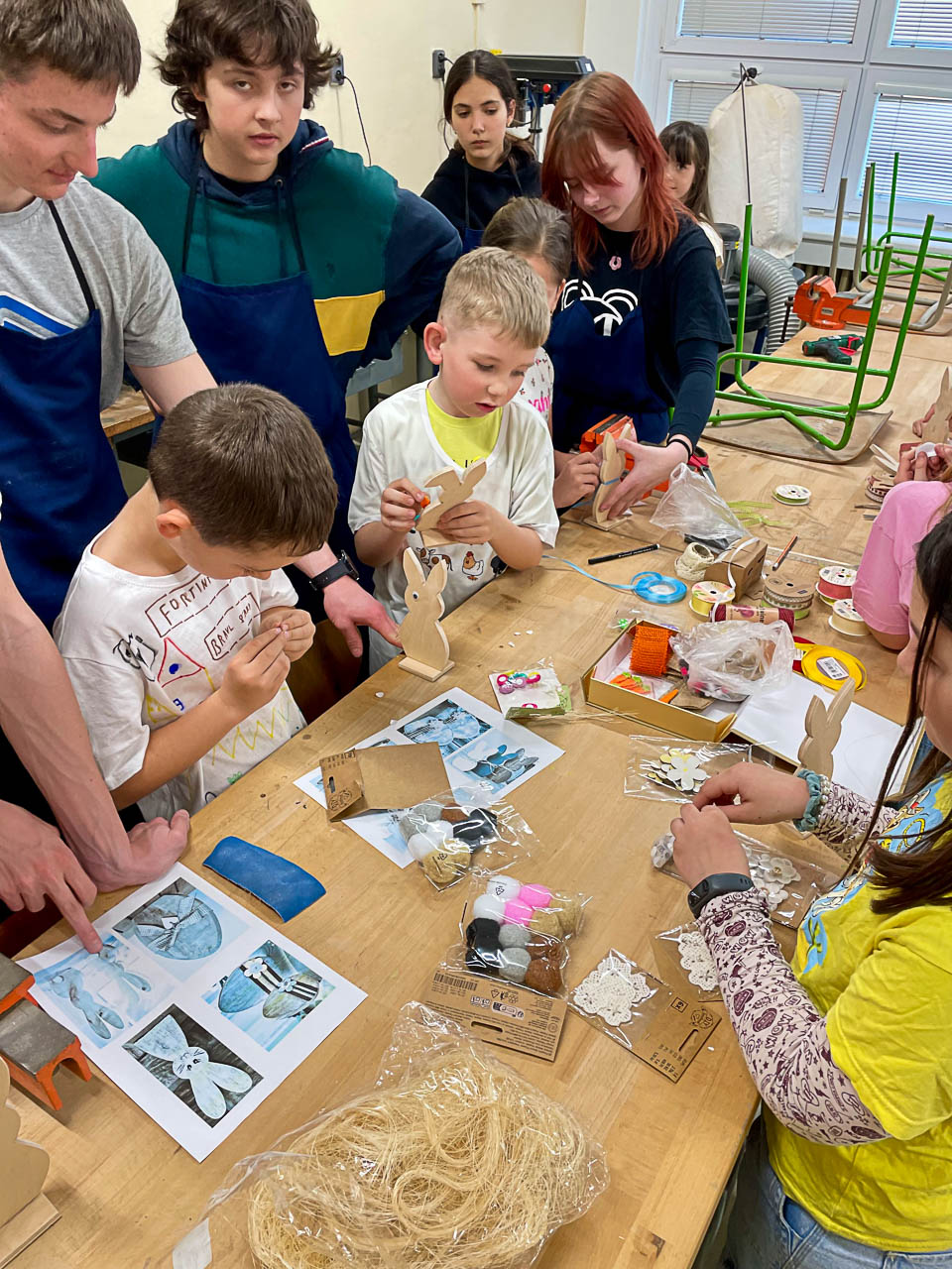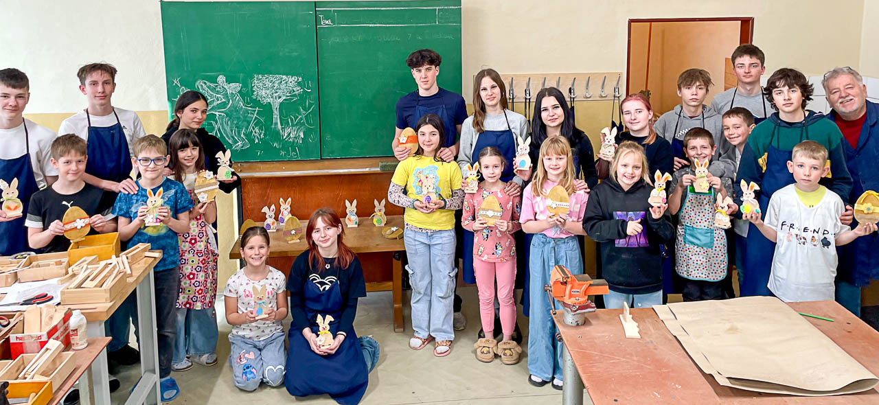 Dne 23. 3. děti z 1. oddělení tvořily ve školních dílnách velikonoční výzdobu do školní jídelny. Druháci a třeťáci pracovali společně s deváťáky, kteří je při práci vedli, pomáhali a radili, jak postupovat. Společně vytvořili spoustu velikonočních zajíčků a vajíček, které nám teď budou zpříjemňovat naše stolování. Dětem se práce se dřevem moc líbila a velikonoční dílnu si užily. Děkujeme deváťákům za velmi velkou pomoc.
