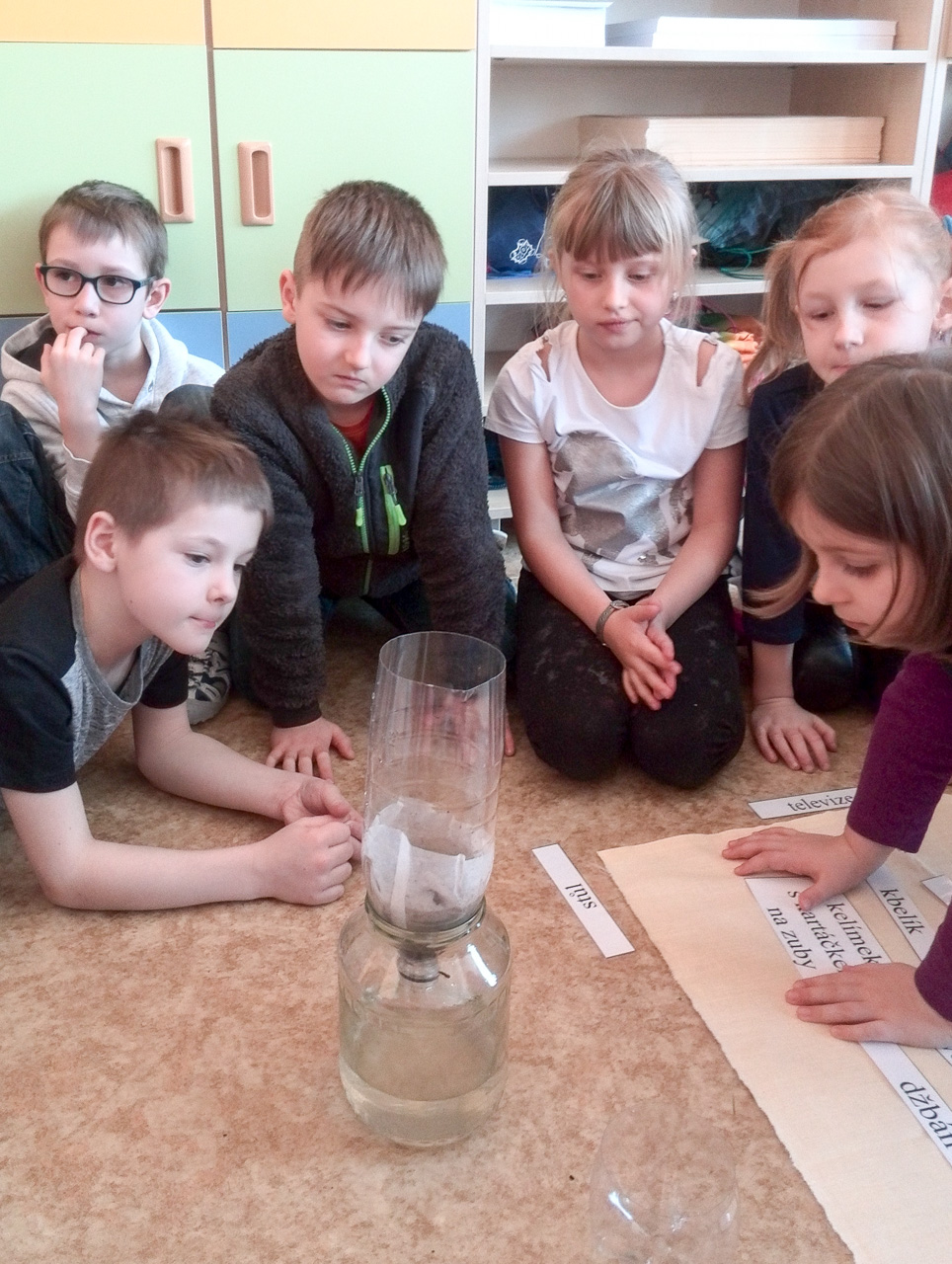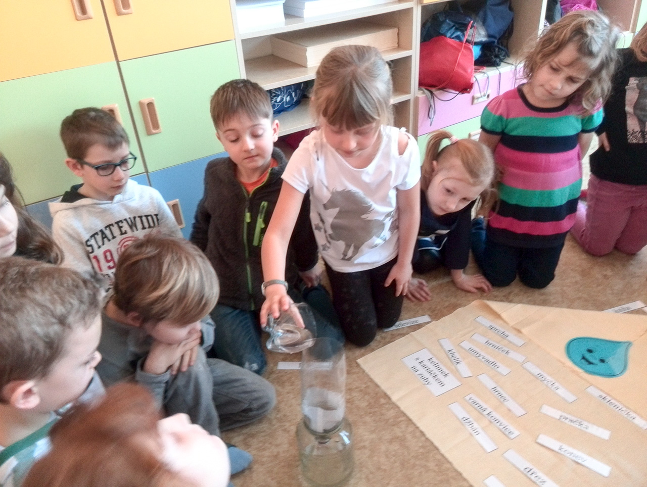 To, že je voda všude kolem nás a v jakých podobách se vyskytuje, prvňáčci vědí. Navázaly jsme na jejich vědomosti a v ekohře Putování kapičky Járy se děti dozvěděly, že kapka vody je „malá cestovatelka“, která zažívá nejen spoustu dobrodružství, ale také dlouhé putování z jedné nádrže do druhé, přes síta a filtry, vodovodním potrubím. Dětem byla nabídnuta aktivita Domeček, zde hledaly možnosti, jak můžeme vodou šetřit. Jednoduchou čističku vody si děti samy vyrobily.