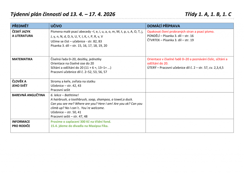 Týdenní plány 1. tříd