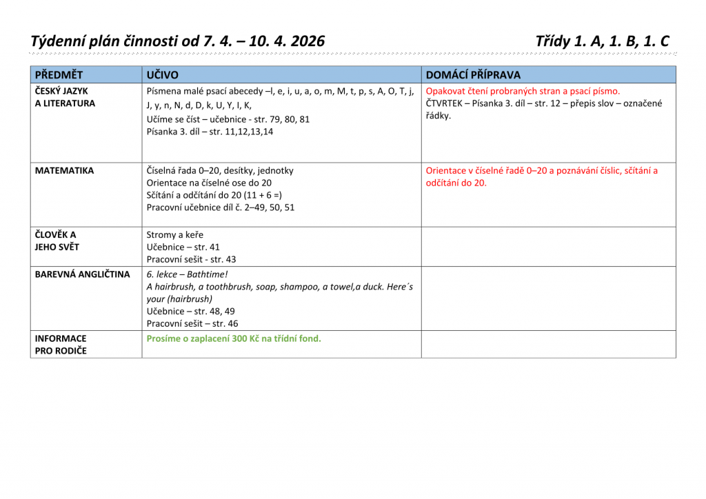 Týdenní plány 1. tříd